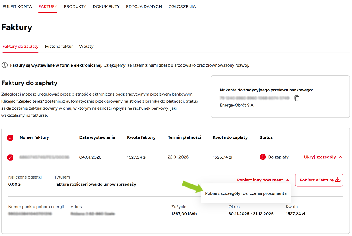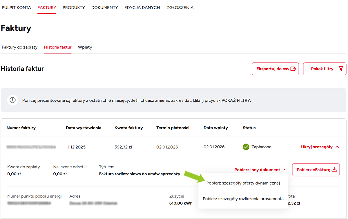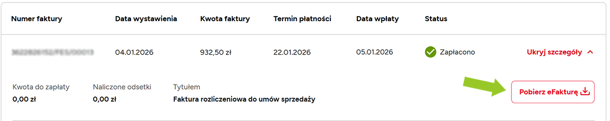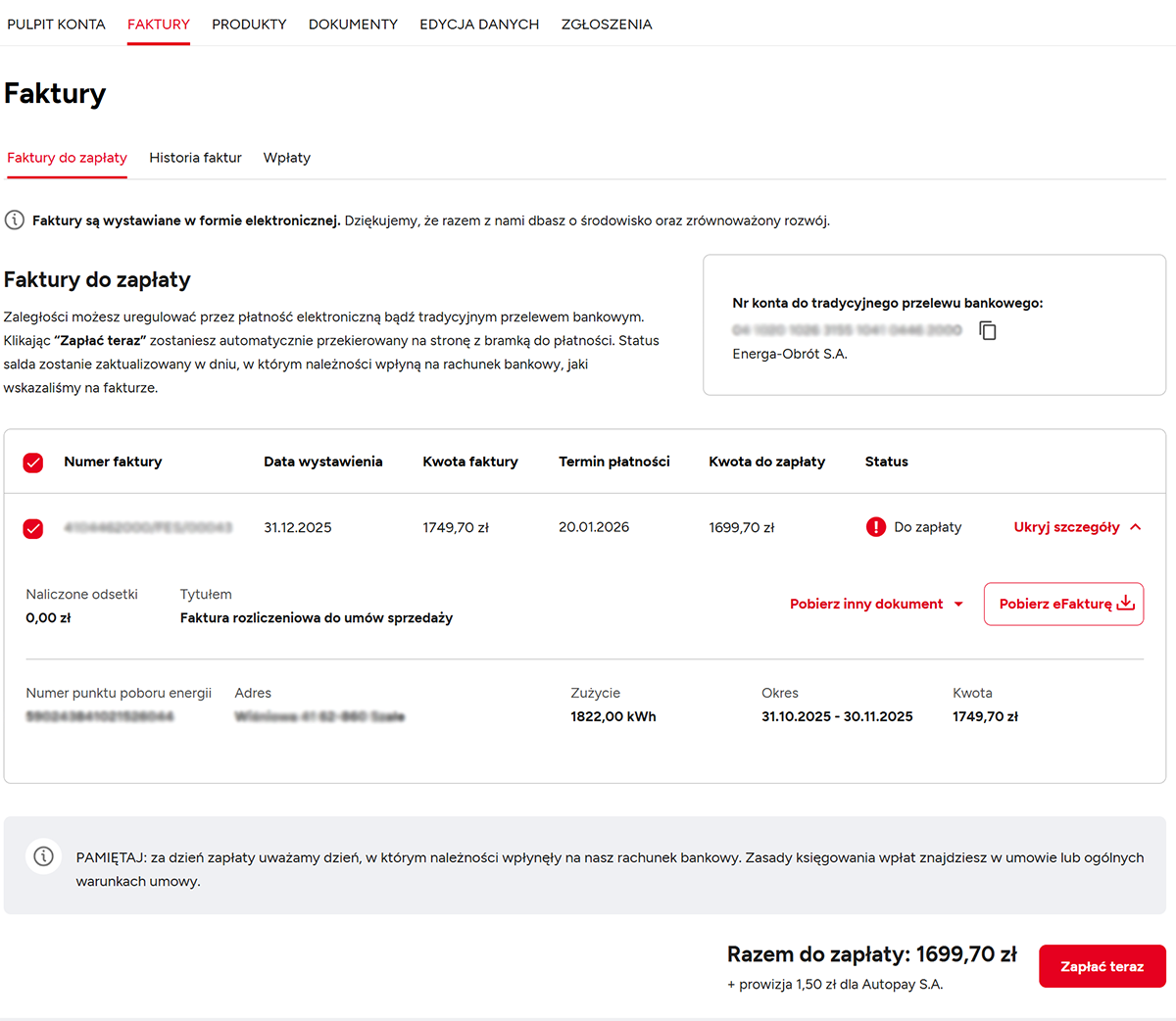 - niedopłatę, co oznacza, że na swoim koncie masz nieopłaconą fakturę za prąd. Możesz kliknąć "Pokaż faktury", aby zobaczyć nieopłacone faktury lub kliknąć "Zapłać teraz", aby przejść do bezpiecznej i szybkiej płatności elektronicznej;
