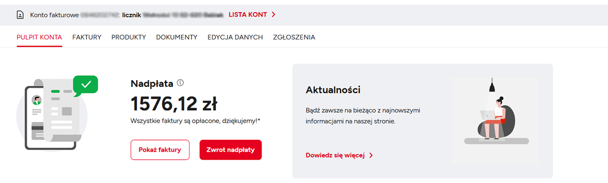- nadpłatę, o której zwrot możesz w prosty sposób zawnioskować klikając przycisk "Zwrot nadpłaty".